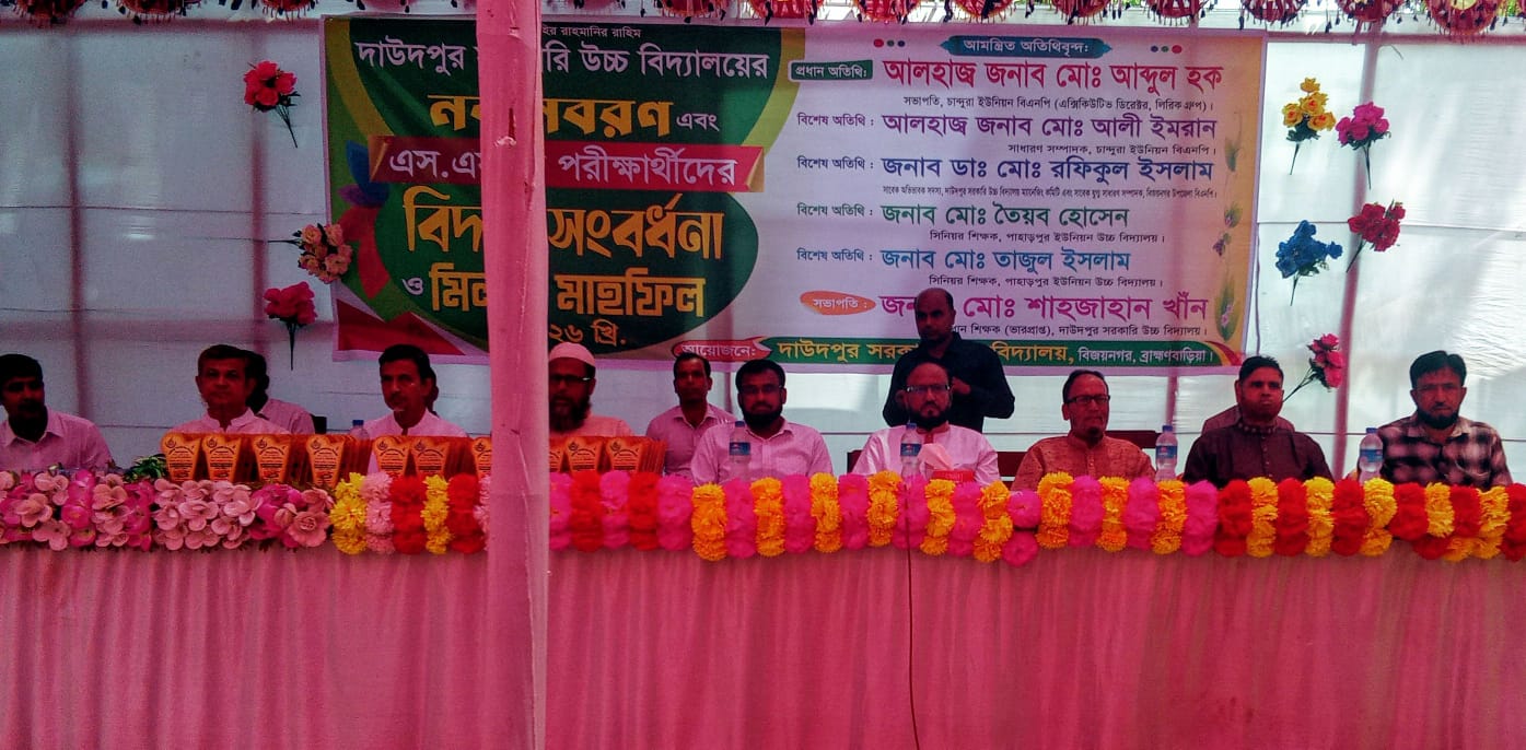 স্টাফ রিপোর্ট:- ব্রাহ্মণবাড়িয়ার বিজয়নগর উপজেলার দাউদপুর সরকারি উচ্চ বিদ্যালয়ে অত্যন্ত আনন্দঘন ও উৎসবমুখর পরিবেশে নবীন শিক্ষার্থীদের বরণ এবং ২০২৬ সালের এস এস সি পরীক্ষার্থীদের বিদায় সংবর্ধনা ও মিলাদ মাহফিল অনুষ্ঠিত হয়েছে। ১২ এপ্রিল ২০২৬, রবিবার সকাল ১১টায় বিদ্যালয় প্রাঙ্গণে এই অনুষ্ঠানের আয়োজন করা হয়।